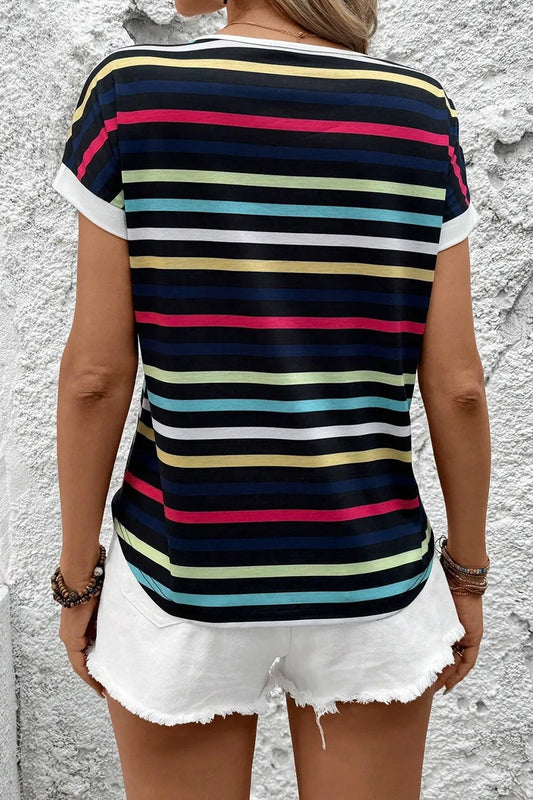 Contrast Striped Notched Ruffled Cap Sleeve Blouse